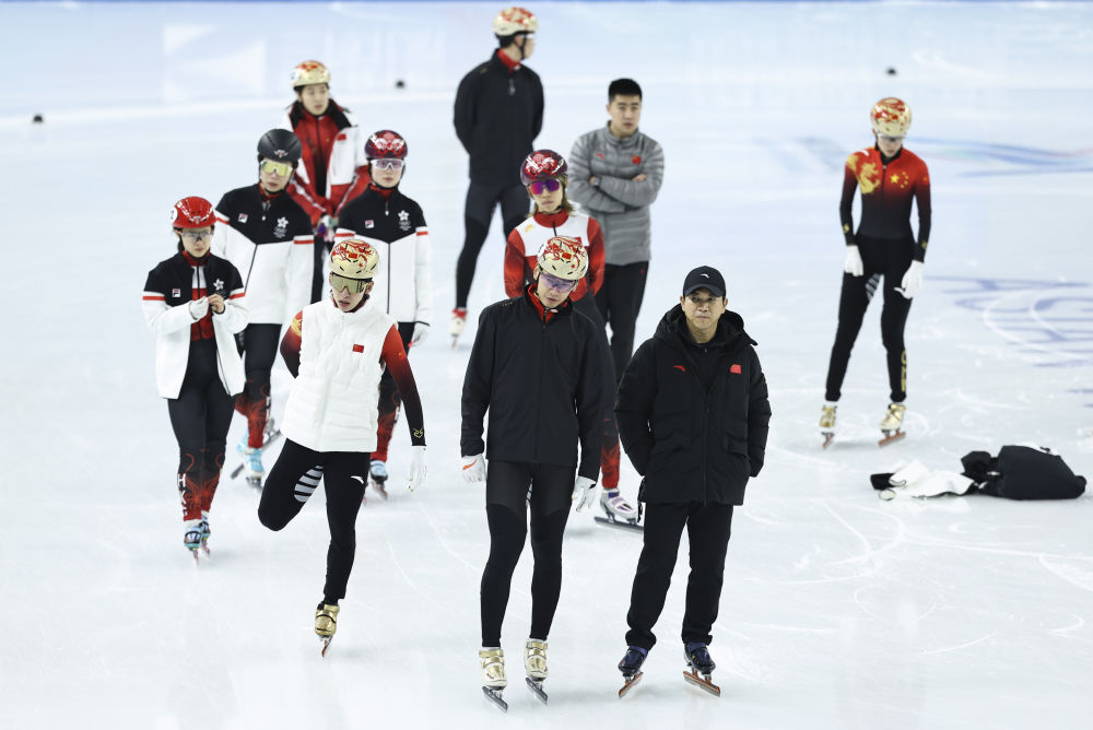 第九届亚冬会将于7日开幕,中国短道速滑队6日进行了赛前训练,主教练张晶和队员们都出现在冰场上,进行最后的备战。