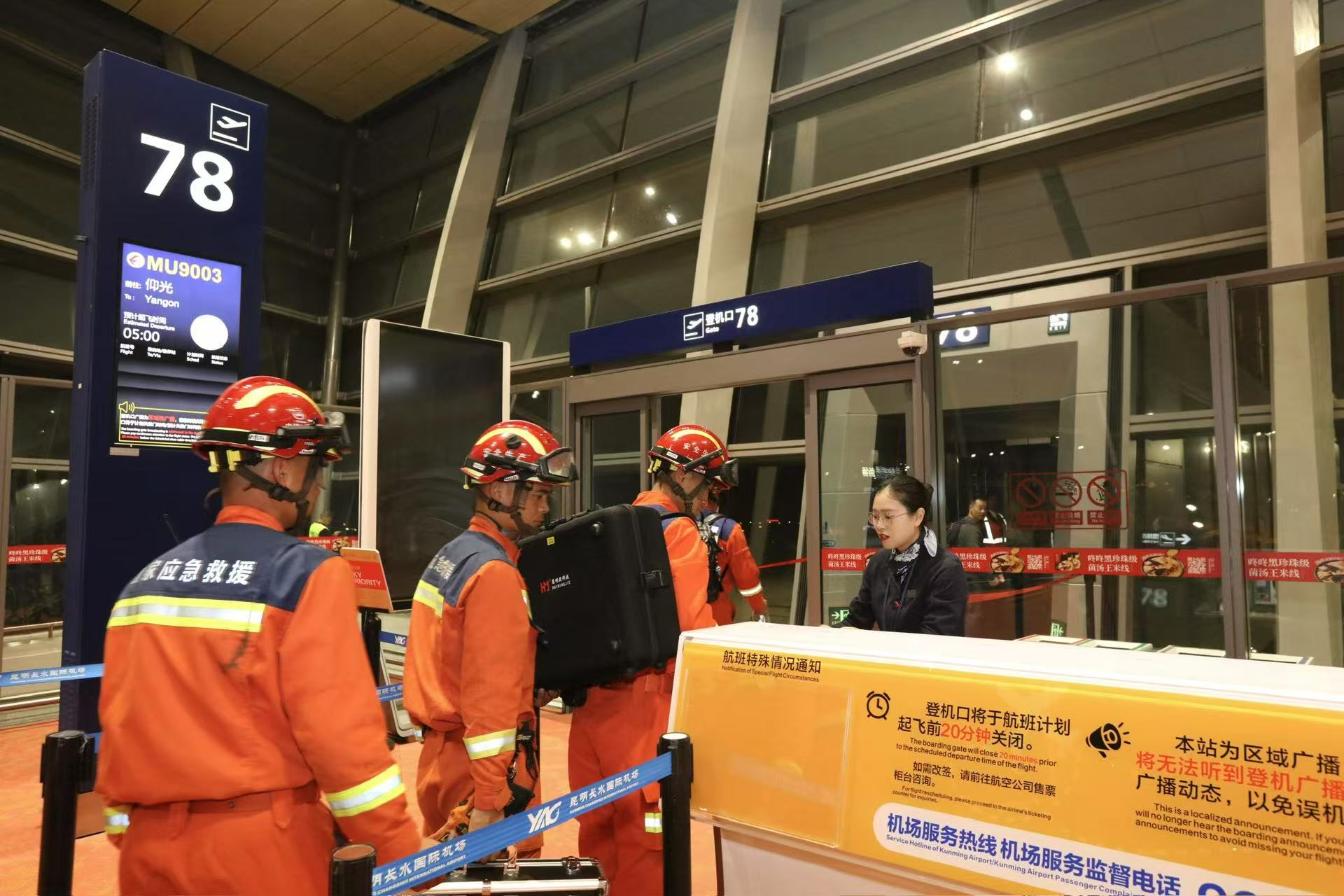 航班抵达缅甸仰光后,应急救援队随即赶赴救援现场开展工作。