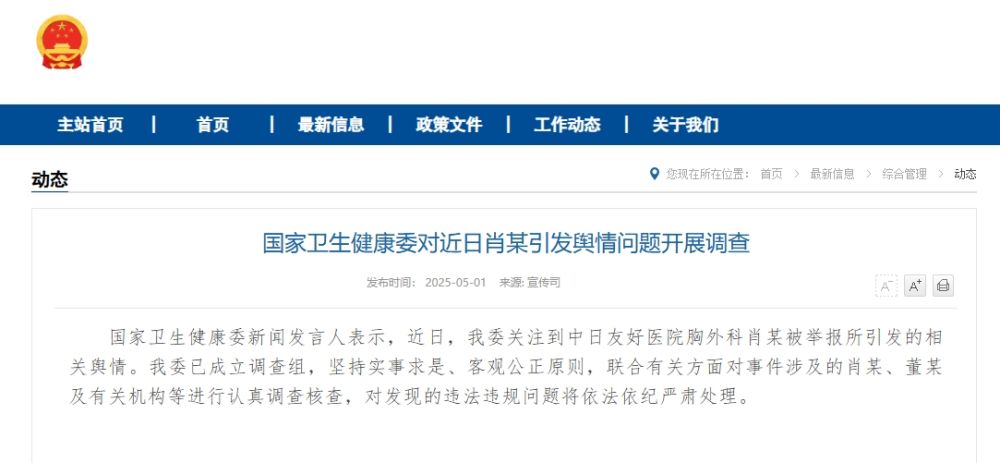 国家卫生健康委新闻发言人表示,近日,国家卫生健康委关注到中日友好医院胸外科肖某被举报所引发的相关舆情。国家卫生健康委已成立调查组,坚持实事求是、客观公正原则,联合有关方面对事件涉及的肖某、董某及有关机构等进行认真调查核查,对发现的违法违规问题将依法依纪严肃处理。