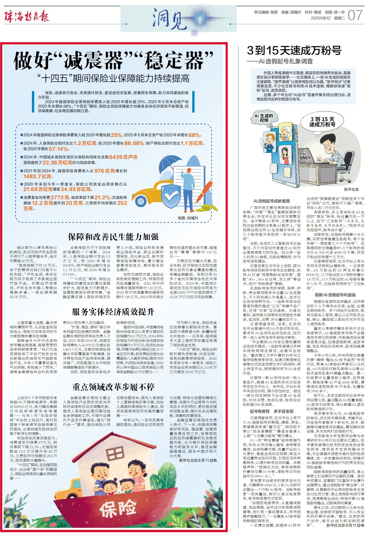 2024年我国保险业原保险保费收入较2020年增长超25%,2025年6月末总资产较2020年末增长68%。“十四五”期间,保险业风险保障能力与服务实体经济质效不断增强,经济减震器、社会稳定器功能凸显。