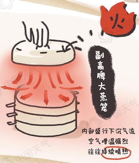 在副热带高压内部盛行下沉气流,晴朗少雨。在这种情况下,太阳辐射可以更多到达地面,使得地面和近地面大气获得更多的热量,就像给地面盖上了一个大蒸笼。因此,陕西关中、黄淮到江南将开启大范围、长时间连续高温闷热天气过程。