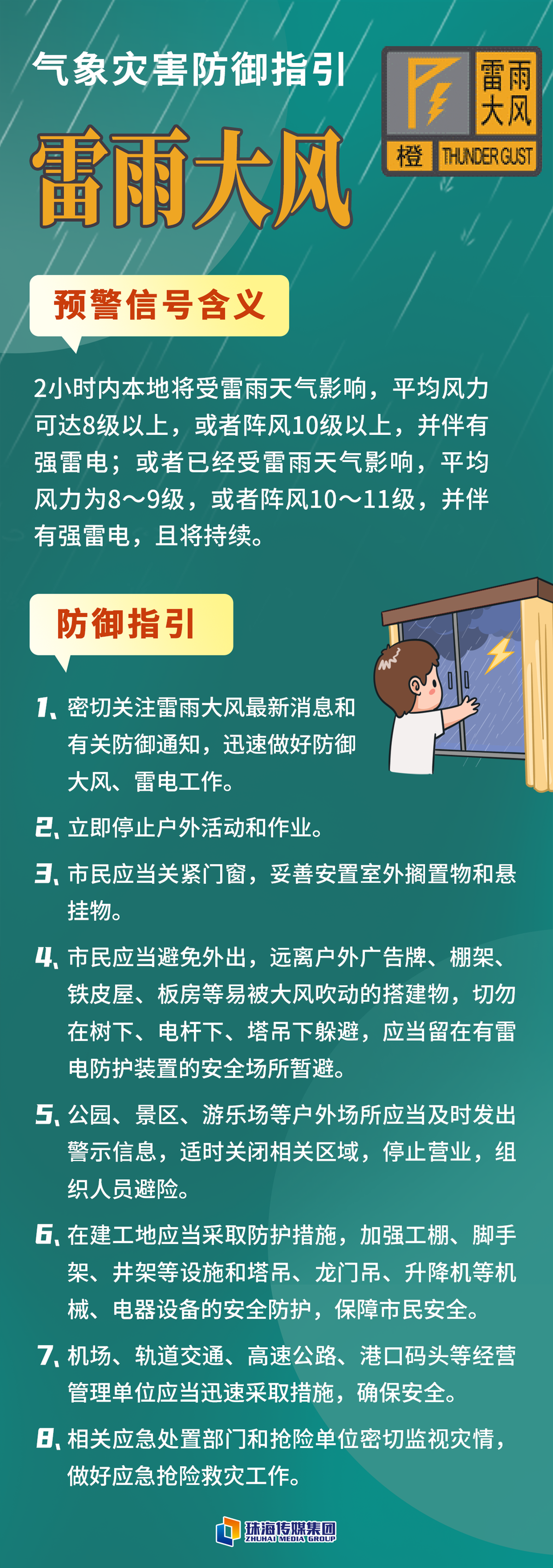 8月17日7时00分,珠海市气象台发布万山区雷雨大风橙色预警信号,受雷雨云团影响,预计万山区将出现雷雨天气,并伴有10-11级短时大风,市气象台已发布万山区雷雨大风橙色预警信号,请注意防御。