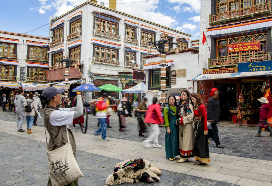 2021年7月,习近平总书记步行察看八廓街风貌,走进特色商品店,询问旅游文创产业发展、藏文化传承保护等情况。总书记感慨地说:“千年八廓街,是我们各民族建起来的八廓街。各民族文化在这里交流交往交融,我们中华民族的大家庭在这里其乐融融。”