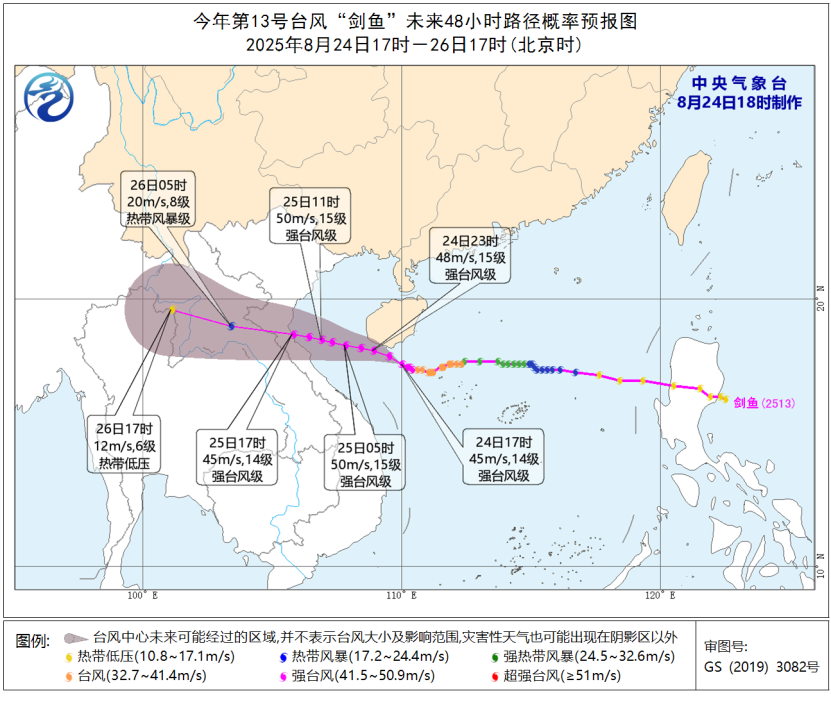 大风预报:8月24日20时至25日20时,南海西部、西沙群岛附近海域、北部湾、琼州海峡、海南岛、广西沿海、广东西部沿海将有6~8级大风,其中南海西北部和中西部的部分海域、北部湾南部海域、海南岛南部沿海的风力有9~11级,“剑鱼”中心经过的附近海域风力可达12~15级、阵风16~17级。降水预报:8月24日20时至25日20时,海南岛、广东西南部、广西南部等地部分地区有大到暴雨,其中海南岛中南部有大暴雨,局地有特大暴雨(250~320毫米)。