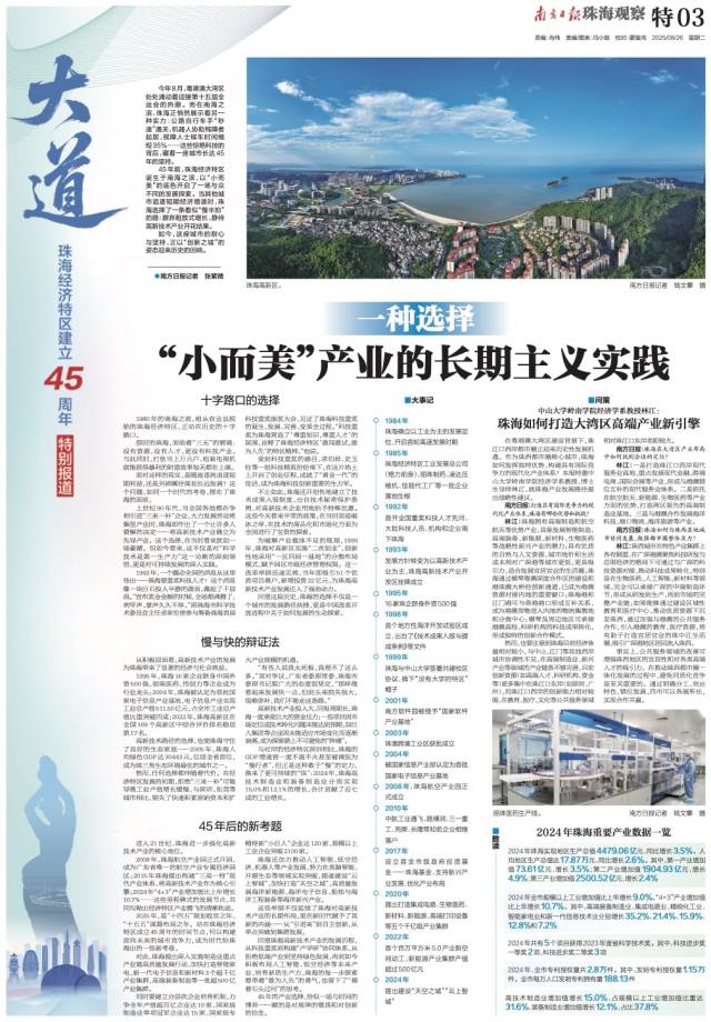 回望珠海高新技术产业的发展历程,从科技重奖到构建“产学研”协同体系,从拒绝低端产业到坚持绿色发展,再到如今积极布局人工智能、低空经济等未来产业,培育新质生产力,珠海的每一步探索都带着“敢为人先”的勇气,也留下了“摸着石头过河”的思考。