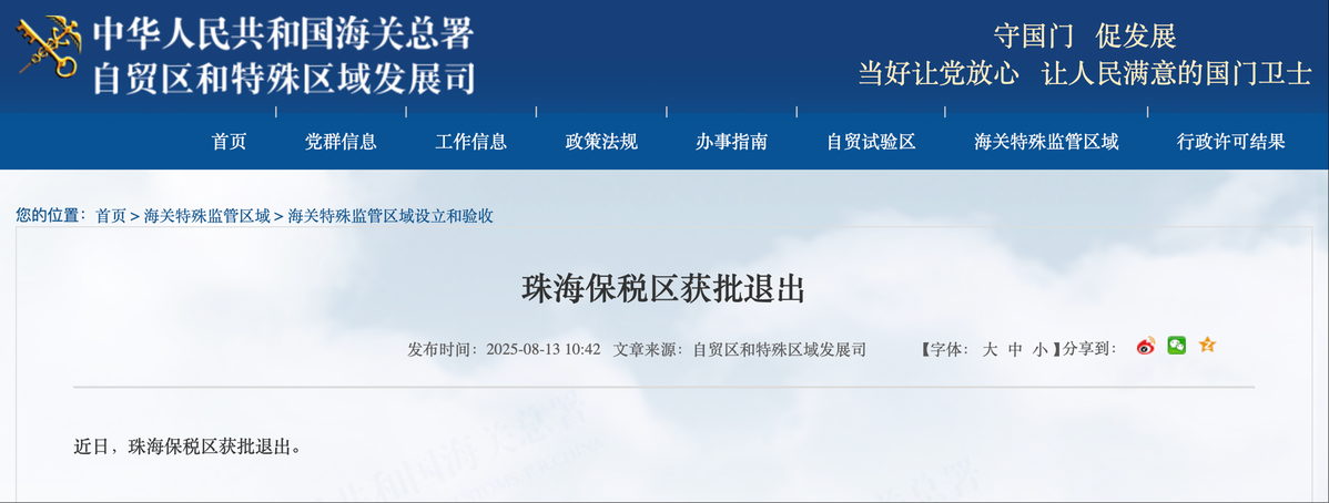 近日,中华人民共和国海关总署自贸区和特殊区域发展司官网发文宣布:珠海保税区获批退出。
