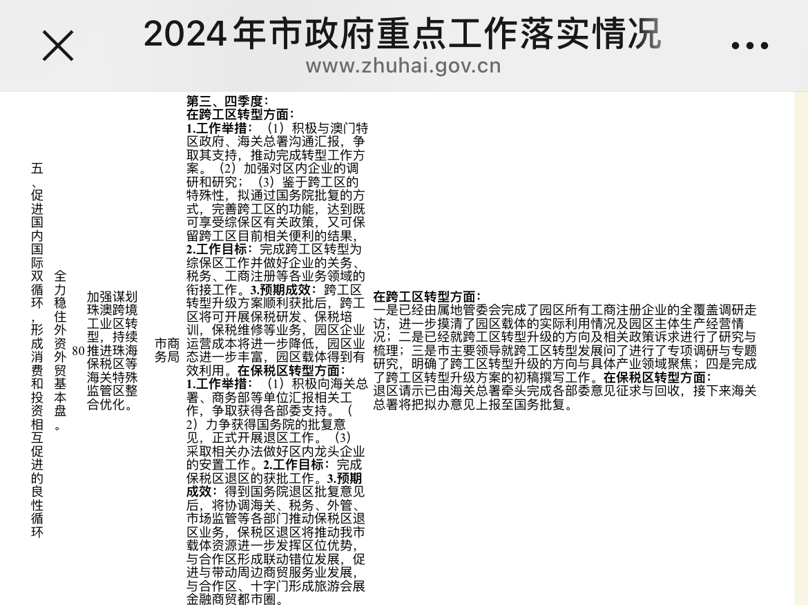 珠海保税区的退出其实早已纳入既定规划。2024年10月,珠海市商务局发布的2024年重点工作进展情况表(第三季度)显示,其中一项具体工作任务为加强谋划珠澳跨境工业区转型,持续推进珠海保税区等海关特殊监管区整合优化。在保税区转型方面,以完成保税区退区的获批工作为工作目标,得到国务院退区批复意见后,将协调海关、税务、外管、市场监管等各部门推动保税区退区业务,保税区退区将推动珠海载体资源进一步发挥区位优势,与合作区形成联动错位发展,促进与带动周边商贸服务业发展,与合作区、十字门形成旅游会展金融商贸都市圈。