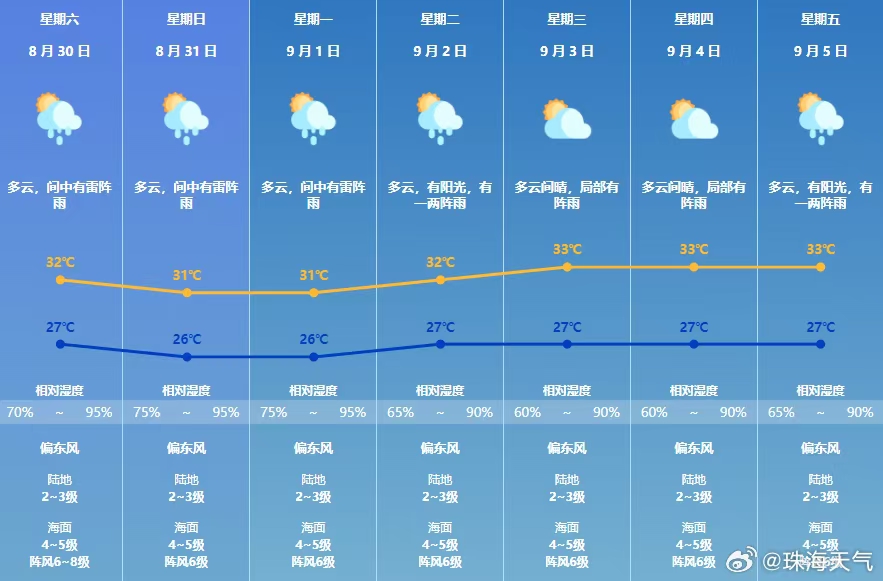 随着其继续远离,预计今天午后我市海面风力逐渐减弱,今明两天我市以多云为主,部分时间有阳光,间中有雷阵雨,气温27-32℃;9月1日多云,间中有雷阵雨,气温26-31℃。9月2-5日多云间晴,间中有一两阵雨,天气炎热。