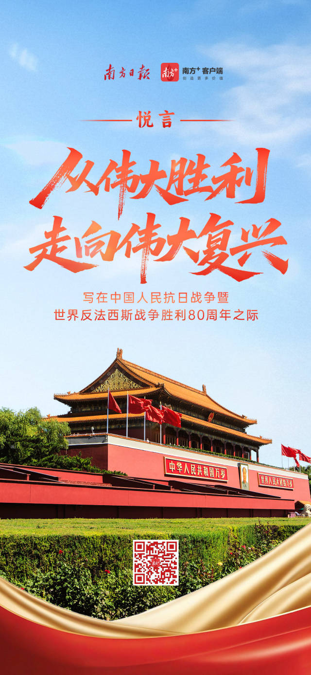 1945—2025,从积贫积弱走向繁荣富强,从被动挨打走向独立自主,从伟大胜利走向伟大复兴。80年过去,中国人民从未像今天这样自信自强,正意气风发以中国式现代化全面推进强国建设、民族复兴伟业。经济总量突破130万亿元,稳居全球第二位,对世界经济增长的贡献率保持在30%左右,发展基础更牢;内需增长潜力巨大,公共服务等领域投资需求旺盛,区域协调发展蕴含巨大市场空间,发展条件更优;全球创新指数排名升至第11位,深圳—香港—广州创新集群跃居全球第一大创新集群,集成电路、人工智能、航天航空等突破不断,发展动力更足……今天的中国,前所未有地靠近世界舞台中心,前所未有地接近实现中华民族伟大复兴的目标,前所未有地具有实现这个目标的能力和信心。