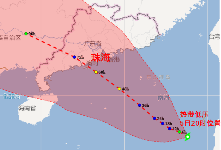 9月5日21时55分,珠海市气象台发布【热带低压生成消息】:原位于菲律宾吕宋岛西侧的热带扰动已于5日20时在南海东部海面(北纬17.5度,东经118.8度)发展为热带低压,其中心距离我市东南方约760公里,中心附近最大风力7级(15米/秒),中心最低气压1002百帕。