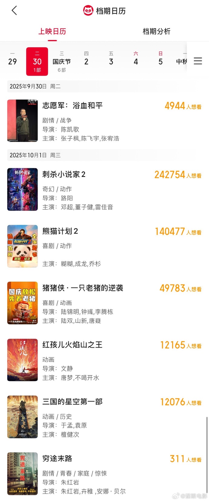 9月8日,《志愿军:浴血和平》官宣定档国庆档上映。据猫眼专业版上映日历显示,截至当前共7部影片定档2025年国庆档上映,分别为《刺杀小说家2》《熊猫计划2》《猪猪侠·一只老猪的逆袭》《红孩儿火焰山之王》《三国的星空第一部》《志愿军:浴血和平》《穷途末路》。