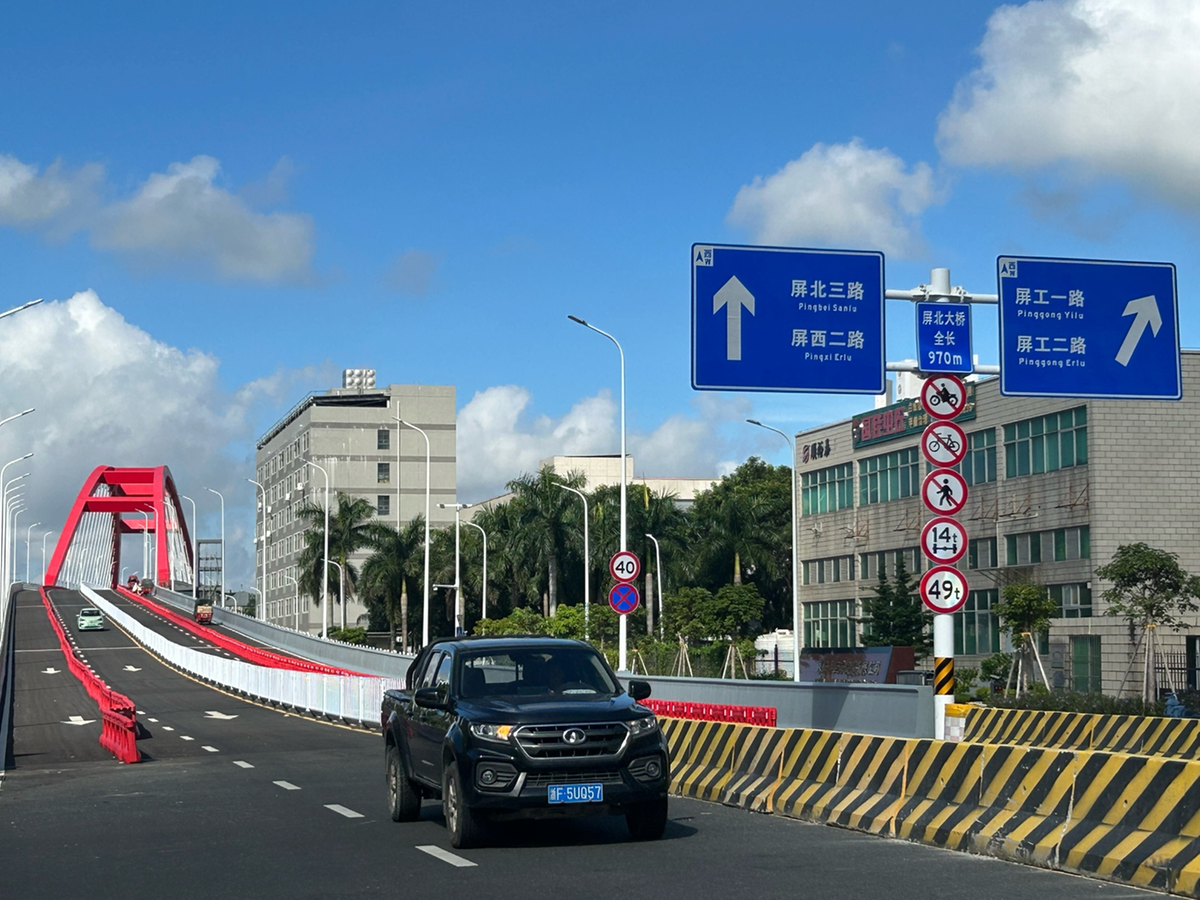 9月11日上午9时,屏北一路与屏北三路连通工程——屏北大桥正式通车。新桥通车后,结束了南屏科技工业园区东西分隔的历史,东西两侧道路通过屏北大桥跨越珠三角环线高速及洪湾涌直接连通,实现立体通行。