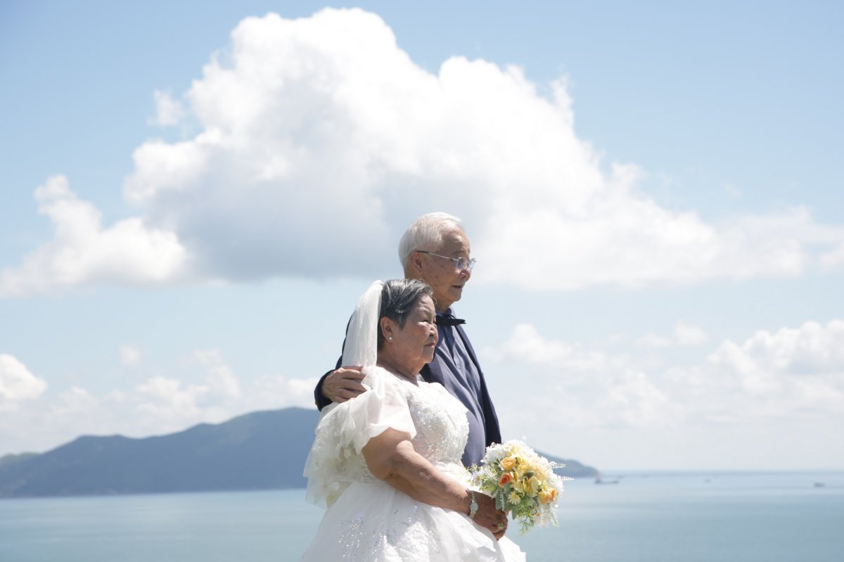 初秋的东澳岛海风轻拂,爱意绵长。拍摄现场,老人们身着婚纱礼服,手挽手在镜头前亮相。他们中最年轻的60岁,最年长的已逾80高龄。年轻时以渔业为生的他们,在艰苦岁月中相濡以沫,却因当时条件所限,未能拍摄婚纱照片。