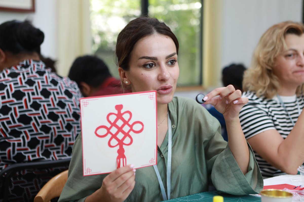 在非遗剪纸店,记者们被眼前精美的剪纸作品深深吸引,纷纷拿起剪刀,尝试创作属于自己的剪纸作品。大家在体验中感受着中国传统剪纸艺术的独特魅力,也对金湾的文化传承有了更深刻的认识。阿尔巴尼亚24小时新闻电视台记者、主持人达尔亚娜·塞伊迪阿非常用心地剪出了中国结,这个作品让她非常满意。“我非常享受这次活动,这是我第一次尝试这种剪纸活动,正如主办方所说,这不仅仅是一项活动,更象征着家庭、民族的团结,我会把这个作为礼物送给我的家人。”