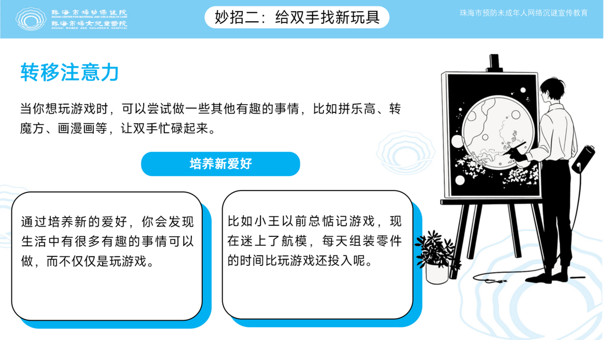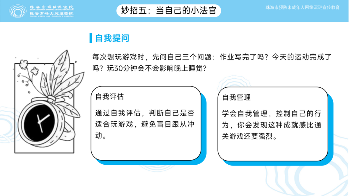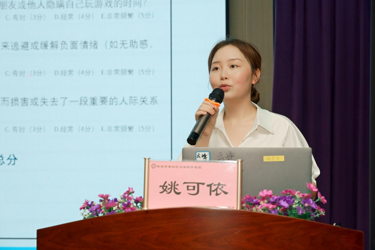 活动邀请到珠海市健康科普青年讲师、珠海市妇幼保健院心理治疗师姚可依授课,主要从如何辨别是沉迷游戏还是正常娱乐、沉迷网络的危害、游戏成瘾的原因、避免沉迷游戏的方法四方面进行讲授。