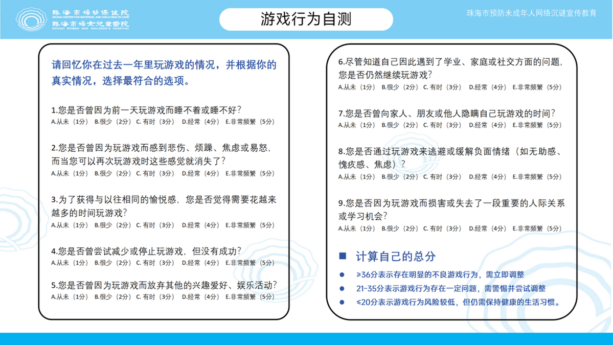 如何辨别自己是沉迷游戏还是正常娱乐呢?姚老师让大家通过9道题进行游戏行为自测,让同学们能直观地判断自己的游戏行为是否处于健康范畴,进而认识到自身可能存在的游戏沉迷风险。
