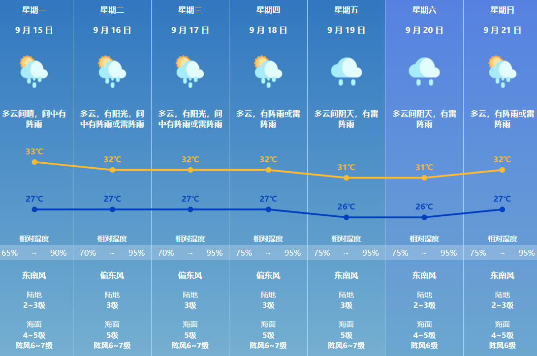 15日,南部市县晴到多云,有分散(雷)阵雨,局部暴雨,其余市县晴间多云。最高气温:南部沿海市县31~33℃,其余市县34~36℃。