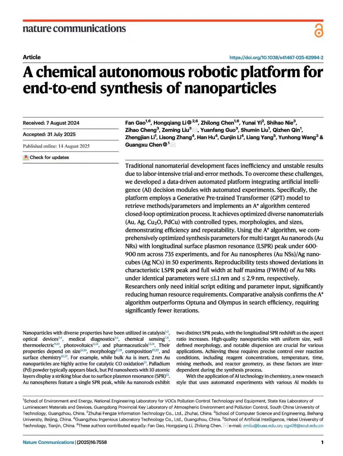 AI何以赋能材料化学?珠海科技企业凤泽信息科技有限公司(以下简称凤泽信息)在业内率先推动二者深度融合,推出NanoAI服务平台,致力于破解材料领域长期存在的研发效率低、成果转化难等痛点问题。近日,其相关研究成果已被国际顶级期刊《自然—通讯》(Nature Communications)正式录用。