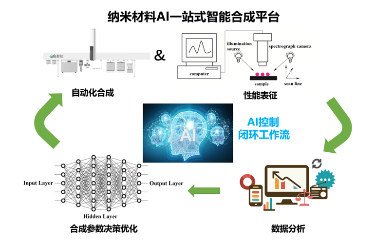 简言之,凤泽信息开发出一套数据驱动的自动化平台NanoAI,融合人工智能决策模块与自动化实验系统,实现了对金、银、铜氧化物等多种纳米材料的高精度控制和多样化合成。此外,团队进一步采用A*算法(一种启发式搜索算法)和强化学习算法,针对金纳米棒(AuNRs)的多目标合成参数开展优化,并通过广泛实验验证了方案的有效性。