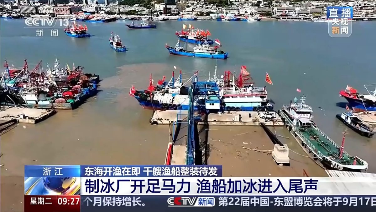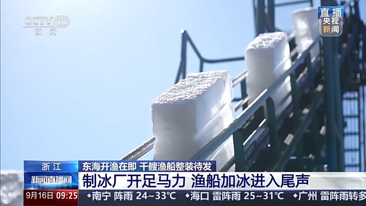 总台记者 吴桐:我现在在宁波市象山县石浦南汇渔村的一家制冰厂。制好的冰块正顺着传送设备源源不断地运送过来,经过破碎机的破碎后,沿着管道注入渔船当中。据介绍,一进入9月,制冰厂就开足马力生产,每天有四五艘船排着队前来加冰。面对用电负荷的激增,当地供电部门也通过组织制冰厂安全用电培训和加强上门检查来确保生产顺利进行。