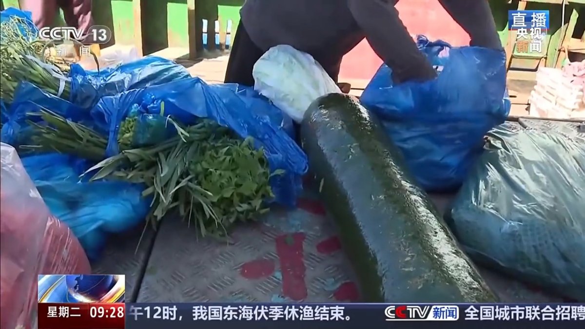 吴桐:除了加装冰块,岸边渔船也正在做开船前最后的生活物资补给,工人正在往船上运送饮用水、米、油等生活必需品,这些物资足够支撑他们一个月的生活。