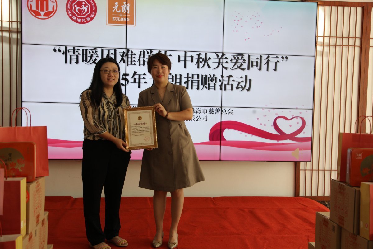 9月17日上午,在中秋佳节即将来临之际,珠海市民政局联合珠海市慈善总会、爱心企业珠海元朗食品有限公司在市民政局举办“情暖困难群体中秋关爱同行”活动。珠海元朗食品有限公司共捐赠爱心物资元朗月饼1289份,总价值139212元。