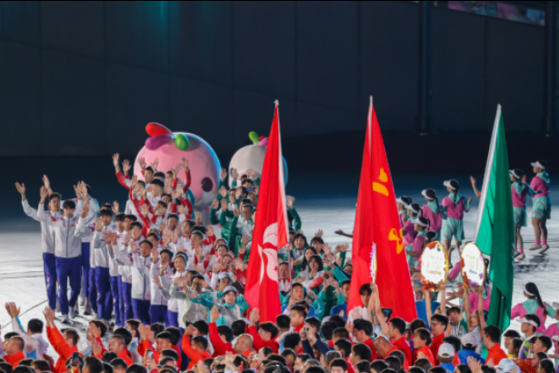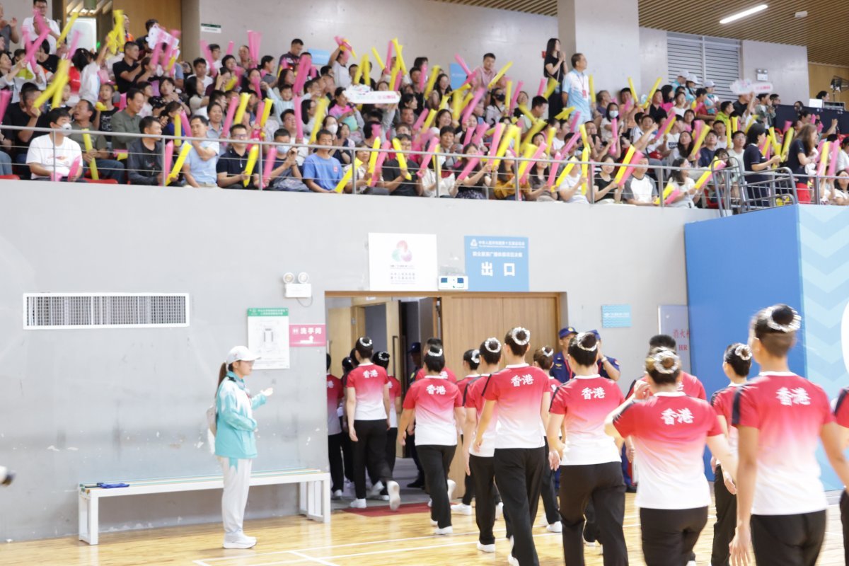 赛场上,香港代表队的队员们统一身着带有紫荆花图案的服装,并向观众展示了精心编排的队形。队员们动作整齐划一、充满力量感,观众们在进场及退场时纷纷向他们报以热烈的掌声与欢呼。