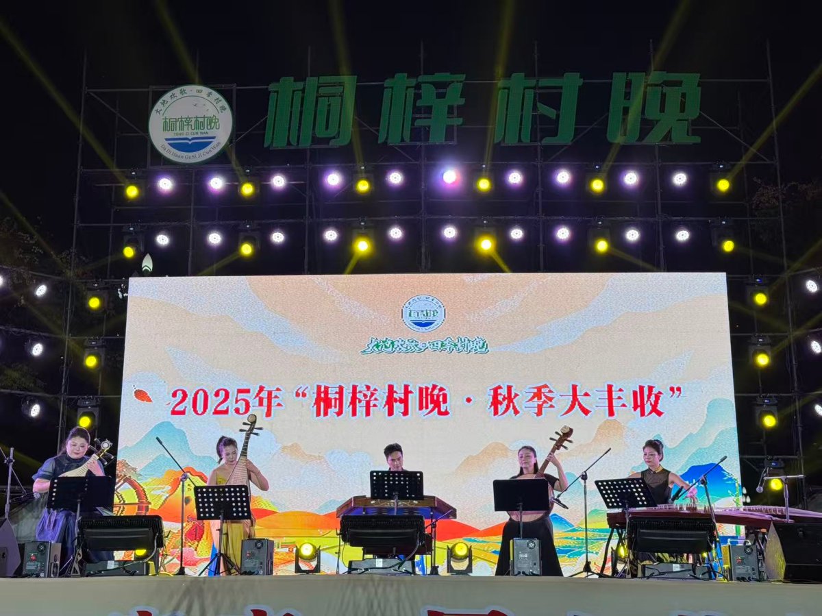在桐梓县秋季“村晚”启动仪式上,金石弹拨乐团携《翡翠》《彩云追月》出演,琵琶的清脆、古筝的悠扬、阮的醇厚、柳琴的活泼、扬琴的宽广,乐器相互交织、融合,绘就一幅动人的音乐画卷,让当地村民与游客在琴声中感受传统文化之美。