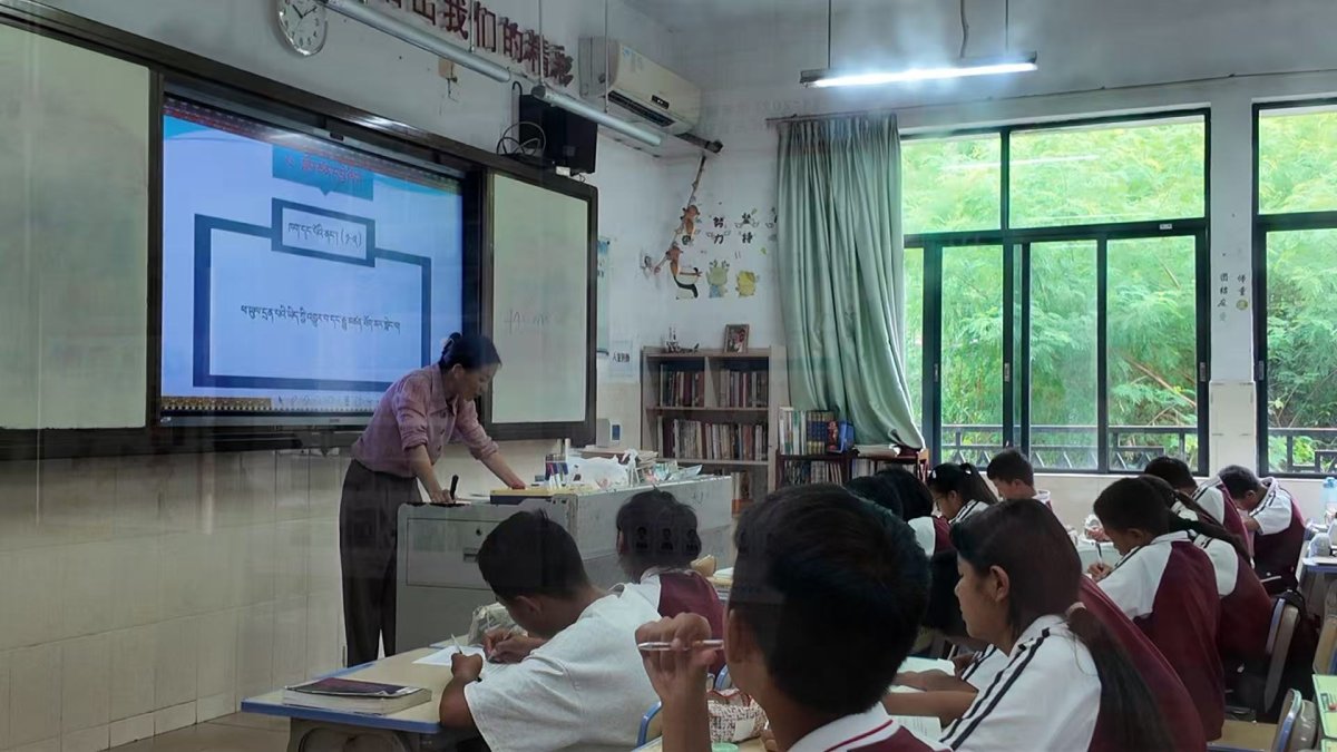 路过教学楼,有的班级里学生在静静的上着自习,有的班上传来朗朗读书声,学生们跟着老师一起念着藏语。“他们在上藏语课。”李赟解释道,学校不少老师志愿值守,陪伴学生度过台风天。