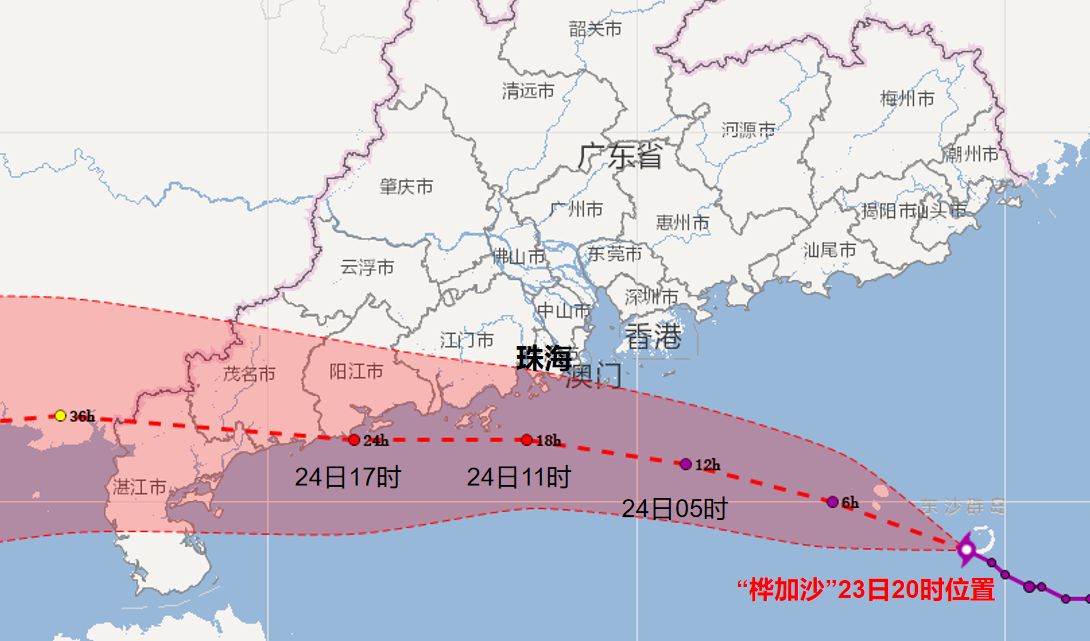 9月23日20时30分,珠海市气象台发布“桦加沙”动态及风雨实况,过去一小时,我市海面风力加大至平均风7-8级阵风8-9级,港珠澳大桥、担杆岛录得最大阵风9级(23.2米/秒和23.1米/秒),并伴有阵雨。