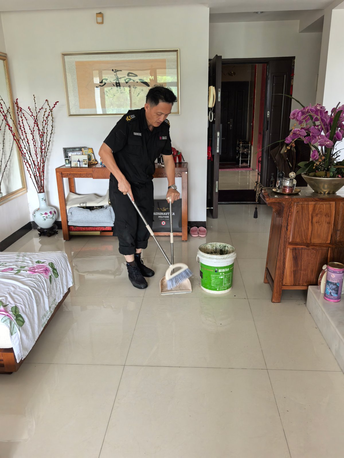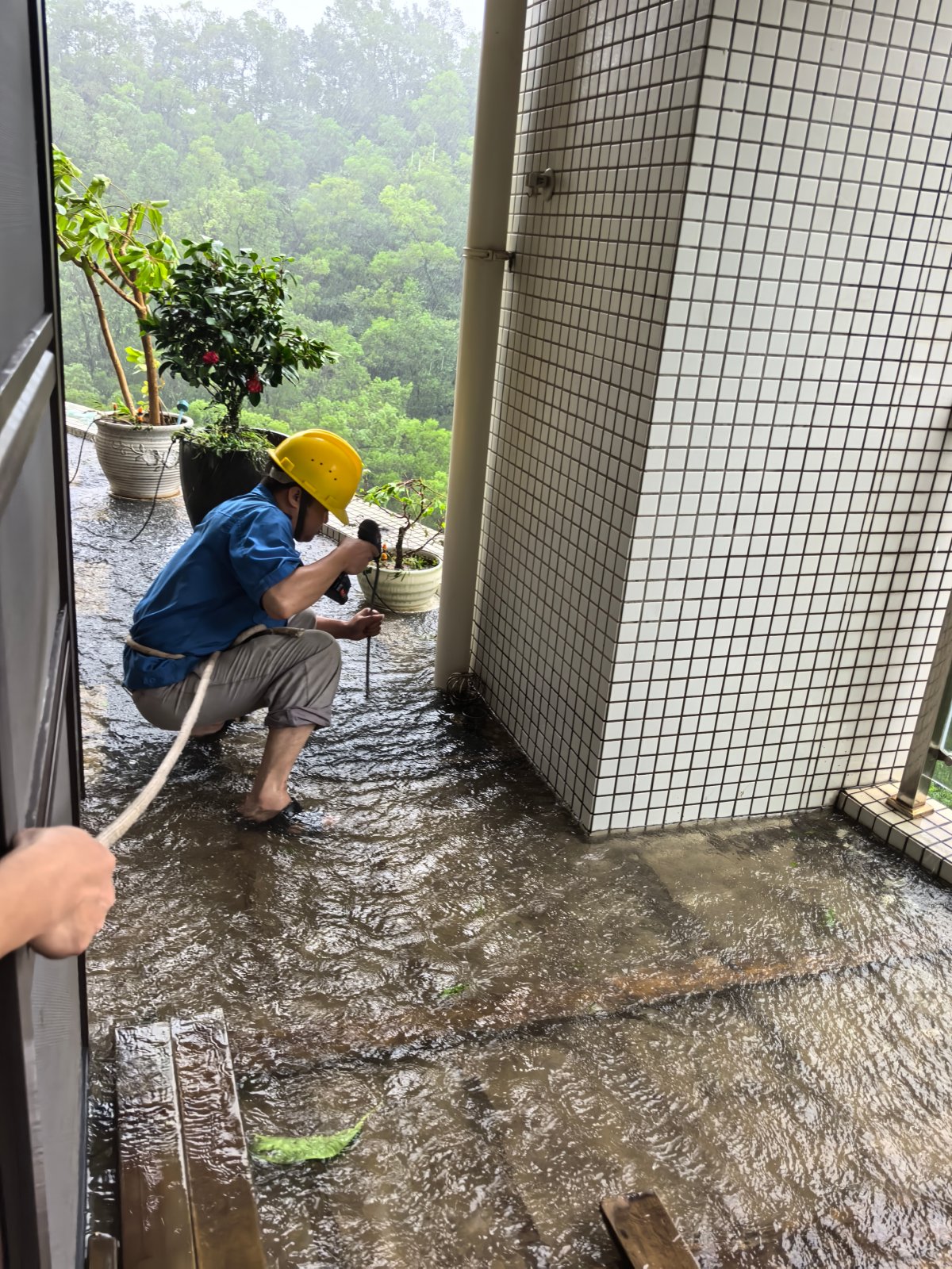随后,物业立即安排人员冒着风雨开展处置工作,一方面疏通阳台堵塞的排水管,从源头解决倒灌问题;另一方面对房屋门窗进行加固,同时清理屋内积水,最大程度减少业主财产损失。妥善处理完该房屋问题后,物业工作人员又继续投入到小区其他区域的台风巡查中。