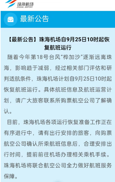 珠海机场9月24日发布公告,9月25日10时起恢复航班运行,详情如下: