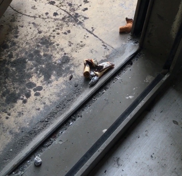 28日上午,记者在现场看到,起火处为11楼某房号门前区域,虽然可燃物和灰烬已经清走,但起火点的焦黑印记、脱落的顶皮和被熏黑的窗户仍清晰可见。同时,记者发现,该楼层楼梯间窗口位置有不少烟头和烟灰。