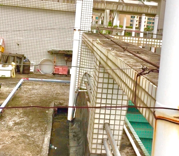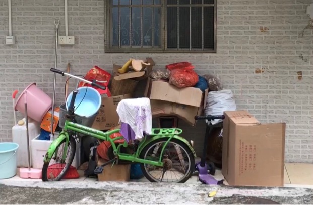 在志威路附近的一处小区,根据市民线索,记者来到其中一栋居民楼的顶层。这里是两个单元楼应急消防通道的重要通行区域。在其中一侧,楼顶的公共空间被人用多条铁丝阻拦。在该单元楼安全门靠近楼梯间的位置,也堆放着纸盒和多种生活杂物。如有火星散落,也易引发火灾。