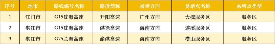 经广东省公安厅交通管理局与省交通运输厅联合研判,今年国庆中秋假期期间繁忙高速公路路段(含收费站、高接高枢纽互通)共10处;车流繁忙服务区共5处;充电繁忙服务区共3处。