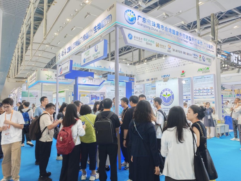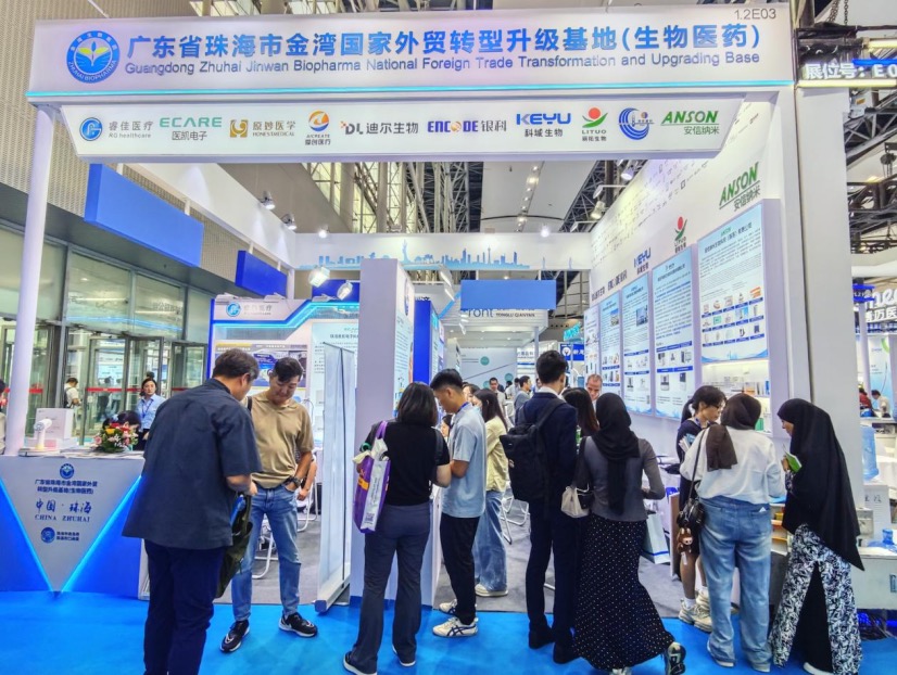 珠海展团总面积357平方米,其中包括36平方米的珠海金湾国家外贸转型升级基地(生物医药)特装展台,集结中科智博、迪尔生物、丽拓生物、银科医学、科域生物等十余家高成长性创新企业,集中展示生物制剂、智能医疗设备、纳米医用材料等领域的百余项前沿成果。展品涵盖安信纳米自主研发的抗菌敷料、医凯电子的智能诊疗系统、丽拓生物的创新体外诊断试剂等,全面呈现珠海从研发到应用的全链条生物医药创新生态。