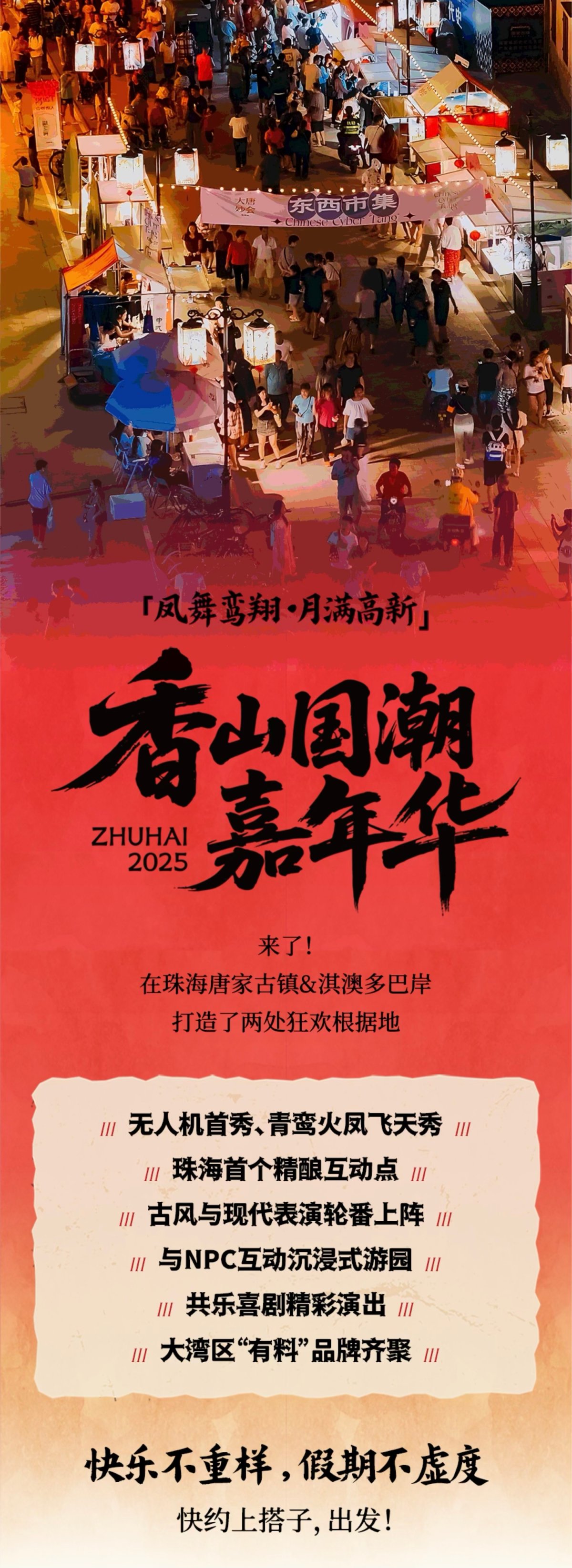 国庆期间,以“凤舞鸾翔・月满高新”为主题的香山国潮嘉年华,将串联唐家古镇、淇澳・多巴岸、会同古村、唐家湾沙滩四大特色景点,推出超过50场精彩活动。各会场主题鲜明:唐家古镇聚焦“大唐妙会・悦享唐家”,推出飞天秀、寻宝记、文艺汇演等多元活动;淇澳・多巴岸营地主打“躺赢山海・诗酒年华”,营造松弛度假体验;会同古村和唐家湾沙滩则将分别呈现非遗艺术荟和滨海民俗活动。