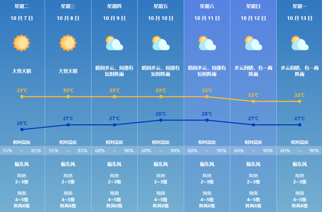 随着台风离开,广东天气热晴回归!预计,未来几天广东天气以多云为主,有分散(雷)阵雨,大部市县最高气温介于33~36℃,体感炎热。