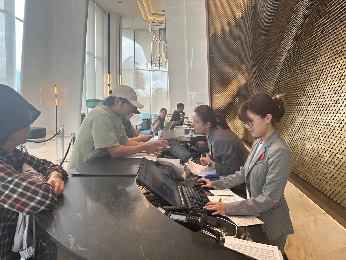 在珠海华发喜来登酒店,记者看到带着行李箱的客人络绎不绝,前台工作人员正忙碌地为排队等候的客人办理入住手续,休息区的沙发上坐满了稍作休整的亲子家庭。