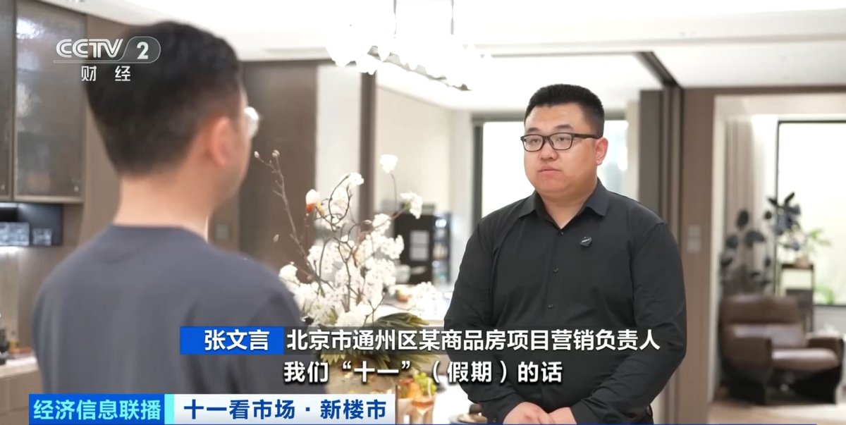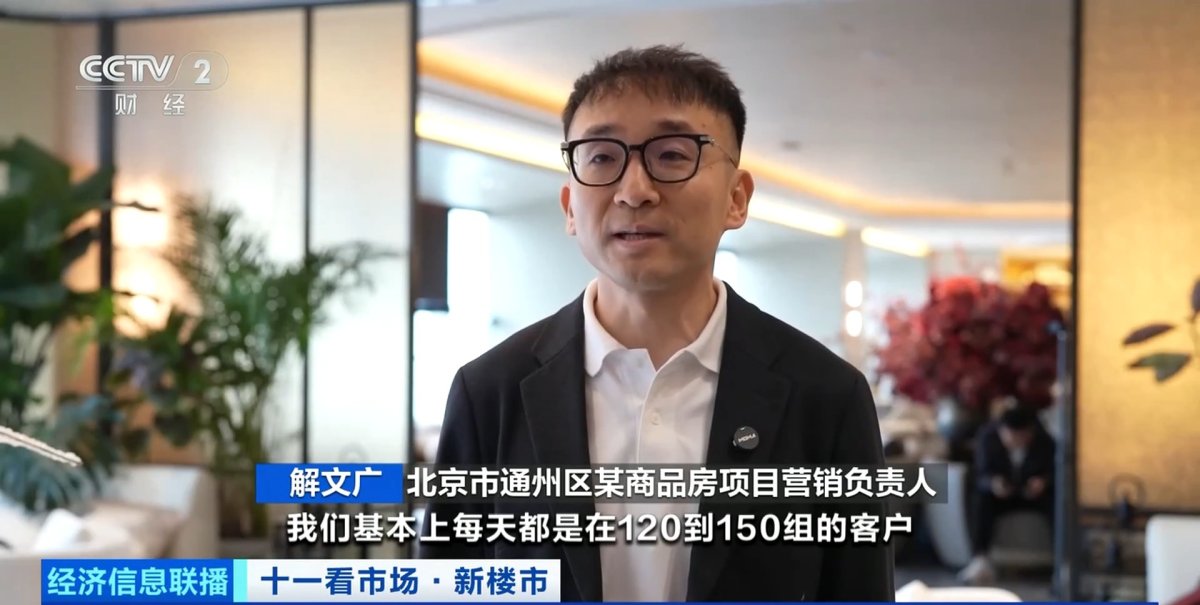 北京市通州区某商品房项目营销负责人张文言:我们持续有实景展示区的呈现,相当于是在全维度上面都可以给客户做到实景的呈现效果。“十一”假期,目前每天到访50到60组客户,随着客户从外地陆续返京,整体的到访量跟成交量可能还会有进一步的上升。