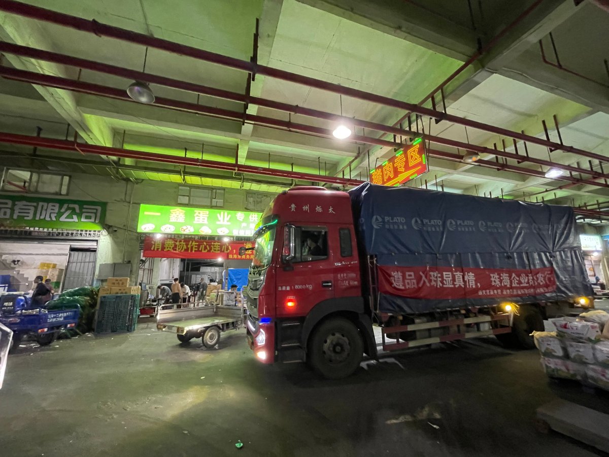 10月8日晚,一辆长约6.8米的货车缓缓驶入珠海浩东农贸综合批发市场。车内满载430箱、总计约21500斤遵义鸡蛋,顺利交付至珠海一鑫贸易有限公司。商户迅速开展验收与分销工作,市场内“消费协作心连心,遵品国庆入珠行”的标语格外醒目。此前,在两地商务部门的见证下,珠海浩东农贸综合批发市场已成功牵线其市场商户——珠海一鑫贸易有限公司,与遵义湄潭县黔湄羽蛋鸡养殖有限责任公司达成采购协议。