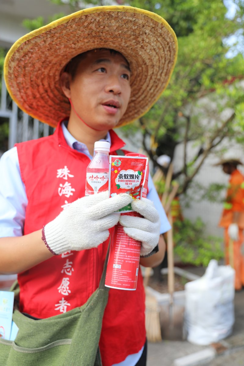 10月9日下午4时,烈日余威尚存,珠海高新区唐家湾镇那洲社区的巷弄里,一个个身着红色志愿者马甲的身影正活跃在房前屋后。他们身背统一绿色挎包,时而俯身检查盆栽底碟的积水,时而帮居民将堆放的柴火垫高,还不忘递上几张宣传单——“您家阳台的水生植物,记得三天换次水。”这群人,被居民亲切地称为“灭蚊背包客”。