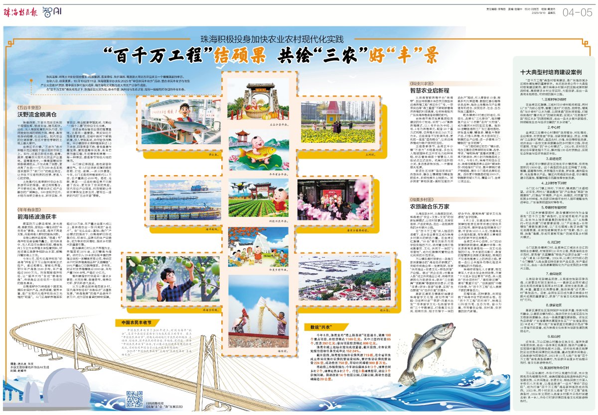 在“百千万工程”春风化雨之下,珠海正以大地为纸、奋斗作墨,执科技与生态之笔,绘制一幅幅绚烂夺目的丰收长卷。