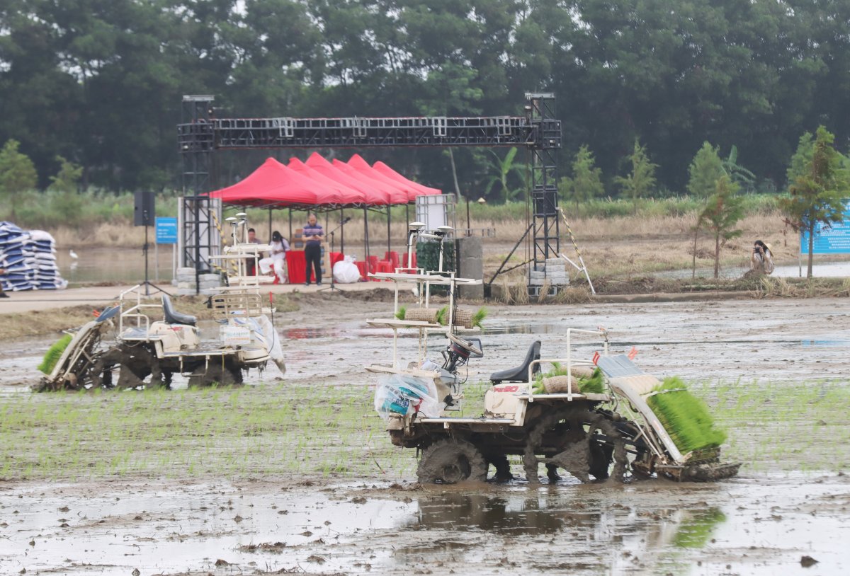 正值春耕季节,金湾区平沙镇“万亩方”水稻基地里,多台无人驾驶插秧机正开足马力抢种早稻,标志着珠海首个智慧无人农场试点正式启动。机械行走阡陌之间,身后是新秧如线,一片碧绿接天延展。