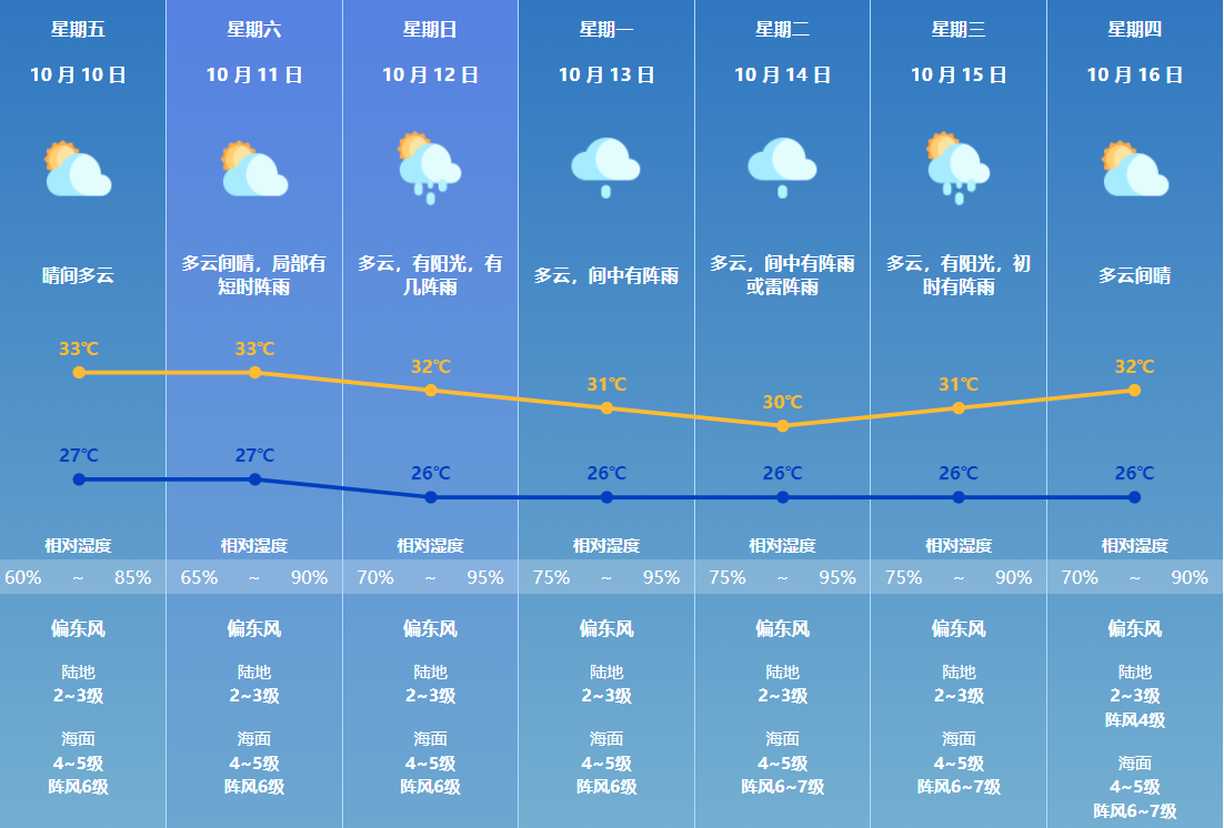 10-11日:全省晴到多云为主,其中粤西多云间阴天有分散(雷)阵雨。最高气温:粤西31~33℃,其余市县33~36℃,局部37℃。