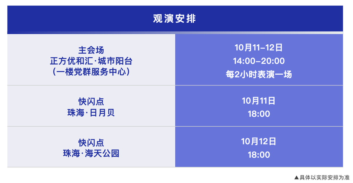 本次活动设置1个主会场与2个分会场,各场地表演安排各有侧重。其中,主会场位于正方优和汇・城市阳台一楼党群服务中心,10月11日至12日每日14:00-20:00每2小时一场表演;日月贝快闪分会场将于10月11日18:00开启,海天公园快闪分会场则在10月12日18:00亮相,为不同区域市民提供便捷的观演选择。