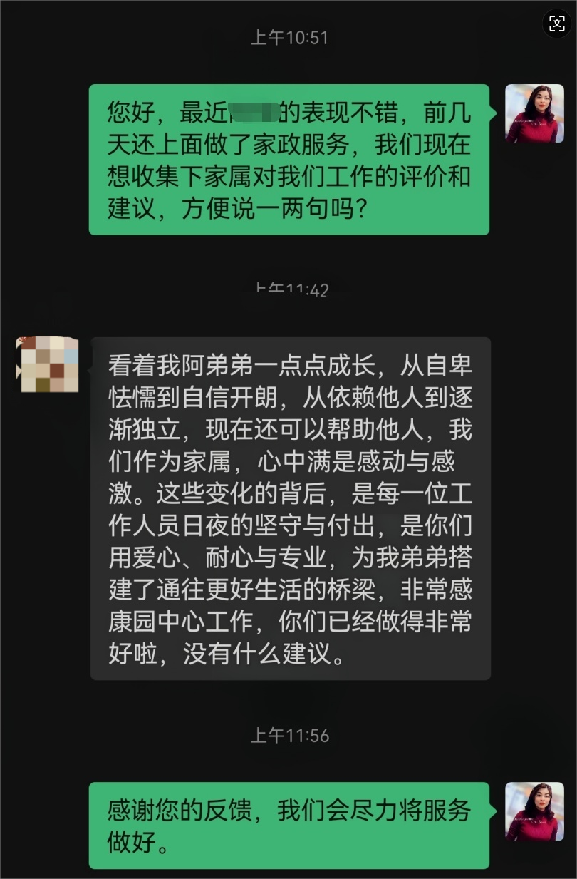 一份家属回访记录中,有这样一段话:“看着我弟弟一点点成长,从自卑怯懦到自信开朗,从依赖他人到逐渐独立,现在还可以帮助他人,我们作为家属,心中满是感动与感激。”