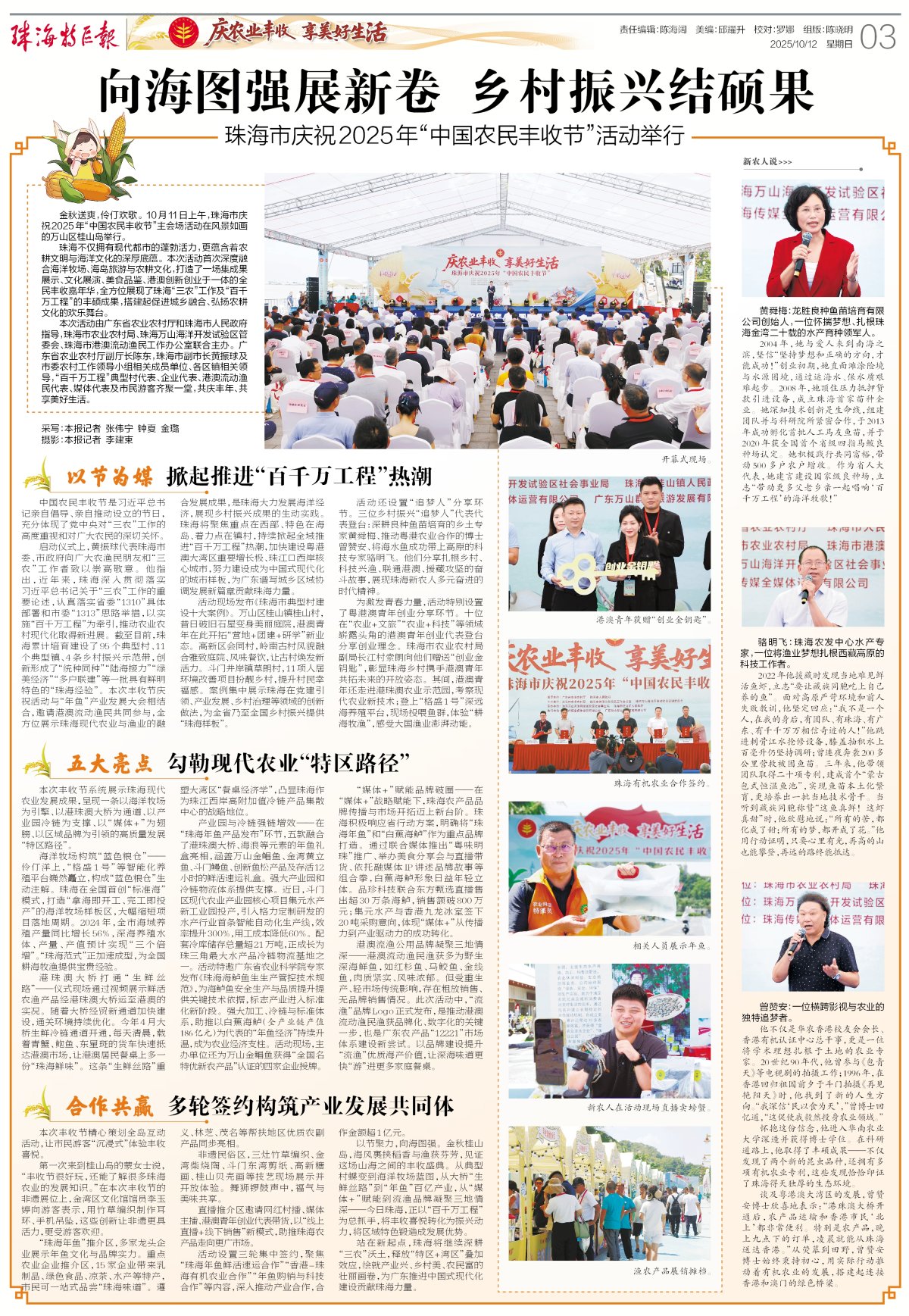 本次丰收节系统展示珠海现代农业发展成果,呈现一条以海洋牧场为引擎、以港珠澳大桥为通道、以产业园冷链为支撑、以“媒体+”为翅膀、以区域品牌为引领的高质量发展“特区路径”。