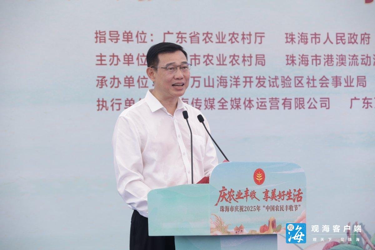 启动仪式上,黄振球代表珠海市委、市政府向长期以来关心支持珠海“三农”工作的省农业农村厅表示衷心感谢,向广大农渔民朋友和“三农”工作者致以崇高敬意。他指出,近年来,珠海深入贯彻落实习近平总书记关于“三农”工作的重要论述,认真落实省委“1310”具体部署和市委“1313”思路举措,以实施“百千万工程”为牵引,推动农业农村现代化取得新进展。截至目前,珠海累计培育建设了95个典型村、11个典型镇、4条乡村振兴示范带,创新形成了“统种同种”“陆海接力”“绿美经济”“多户联建”等一批具有鲜明特色的“珠海经验”。本次丰收节庆祝活动与“年鱼”产业发展大会相结合,邀请港澳流动渔民共同参与,全方位展示珠海现代农业与渔业的融合发展成果,是珠海大力发展海洋经济,展现乡村振兴成果的生动实践。珠海将聚焦重点在西部、特色在海岛、着力点在镇村,持续掀起全域推进“百千万工程”热潮,加快建设粤港澳大湾区重要增长极、珠江口西岸核心城市,努力建设成为中国式现代化的城市样板,为广东谱写城乡区域协调发展新篇章贡献珠海力量。