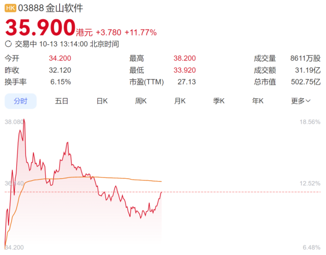 值得注意的是,港股金山软件大涨,盘中一度涨超18%,截至发稿,涨11.77%,报35.9港元/股。